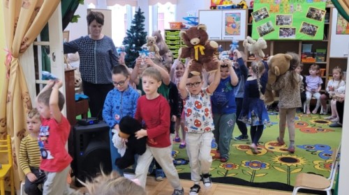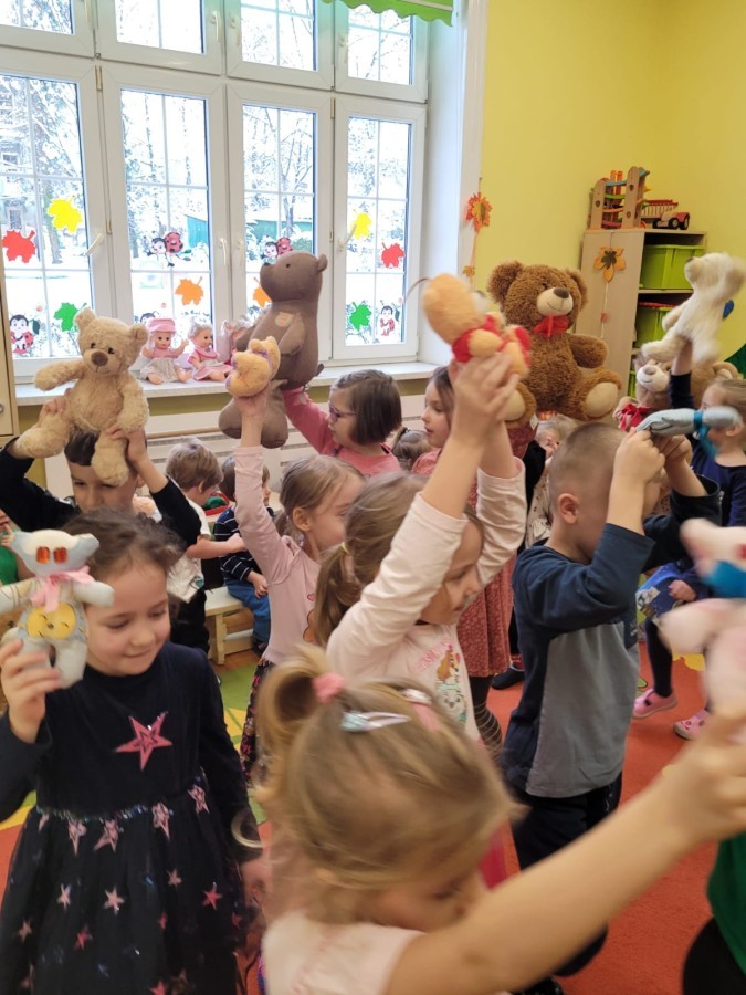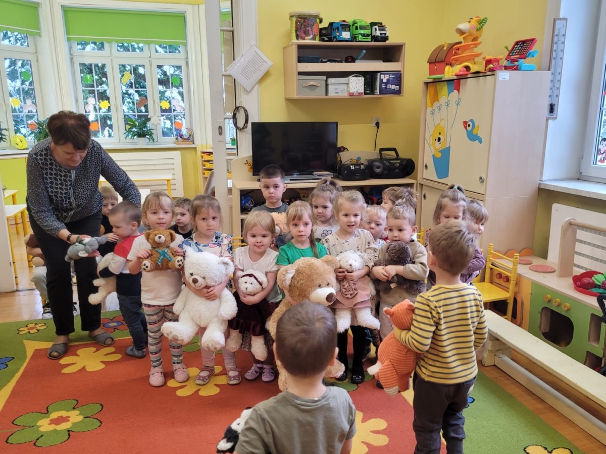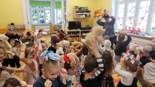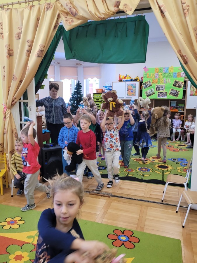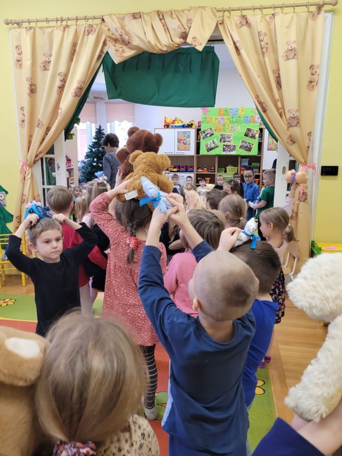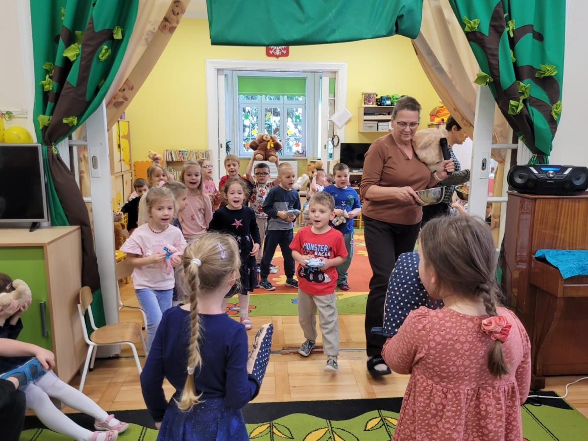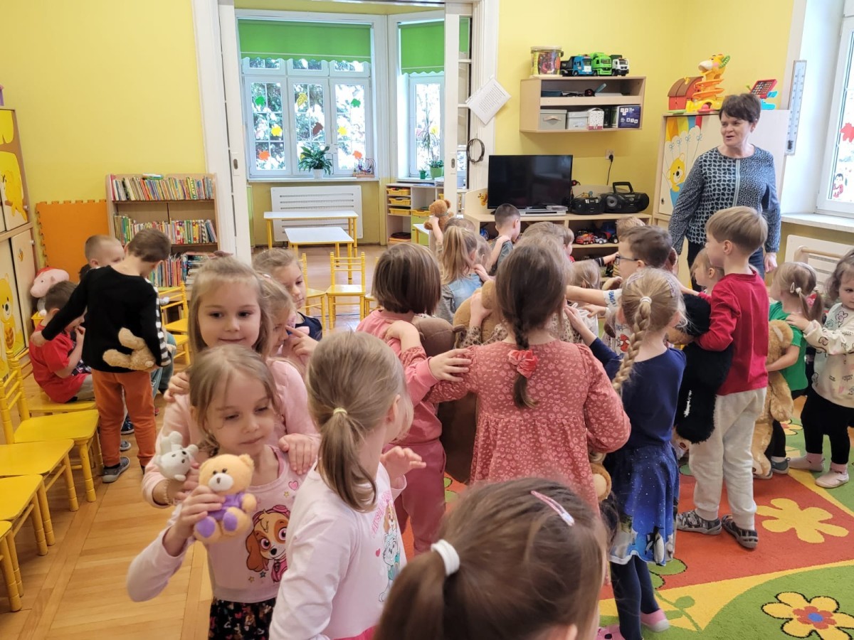 W czwartkowy poranek zgromadziły się dzieci z całego przedszkola wraz ze swoimi ulubionymi pluszowymi misiami z okazji ich święta. Po wstępnej prezentacji przy muzyce prowadząca imprezę Pani Ela zaprosiła przedszkolaki do fantastycznych konkursów. Były wśród nich: składanie obrazków pociętych na części, zjadanie palucha kukurydzianego, zlizywanie miodku z talerzyka, rozwiązywanie zagadek związanych z misiami. Wszystko było przeplatane tańcami z misiem albo dla misia oraz piosenkami tj. „Pluszowy miś”, „Jadą, jadą misie”. Na koniec dzieci złożyły życzenia misiom i odśpiewały tradycyjne „Sto lat”.