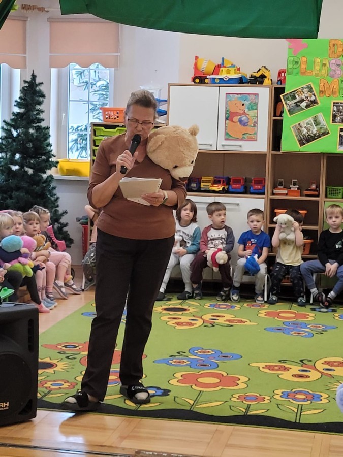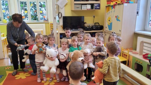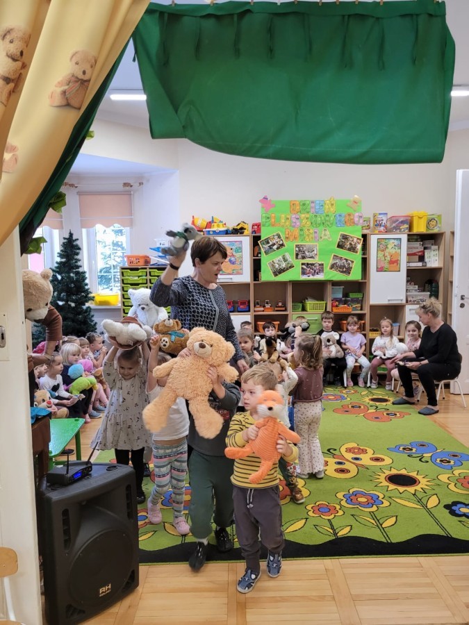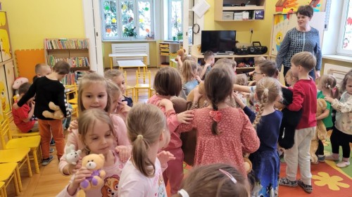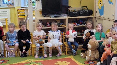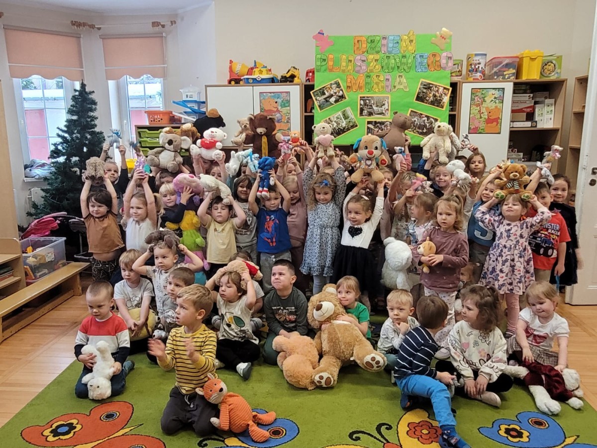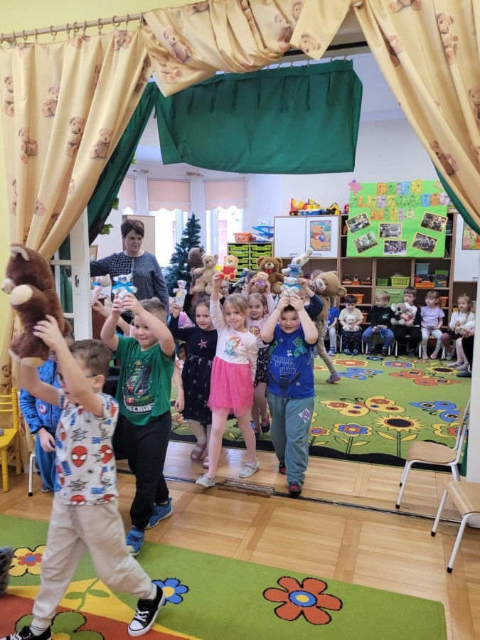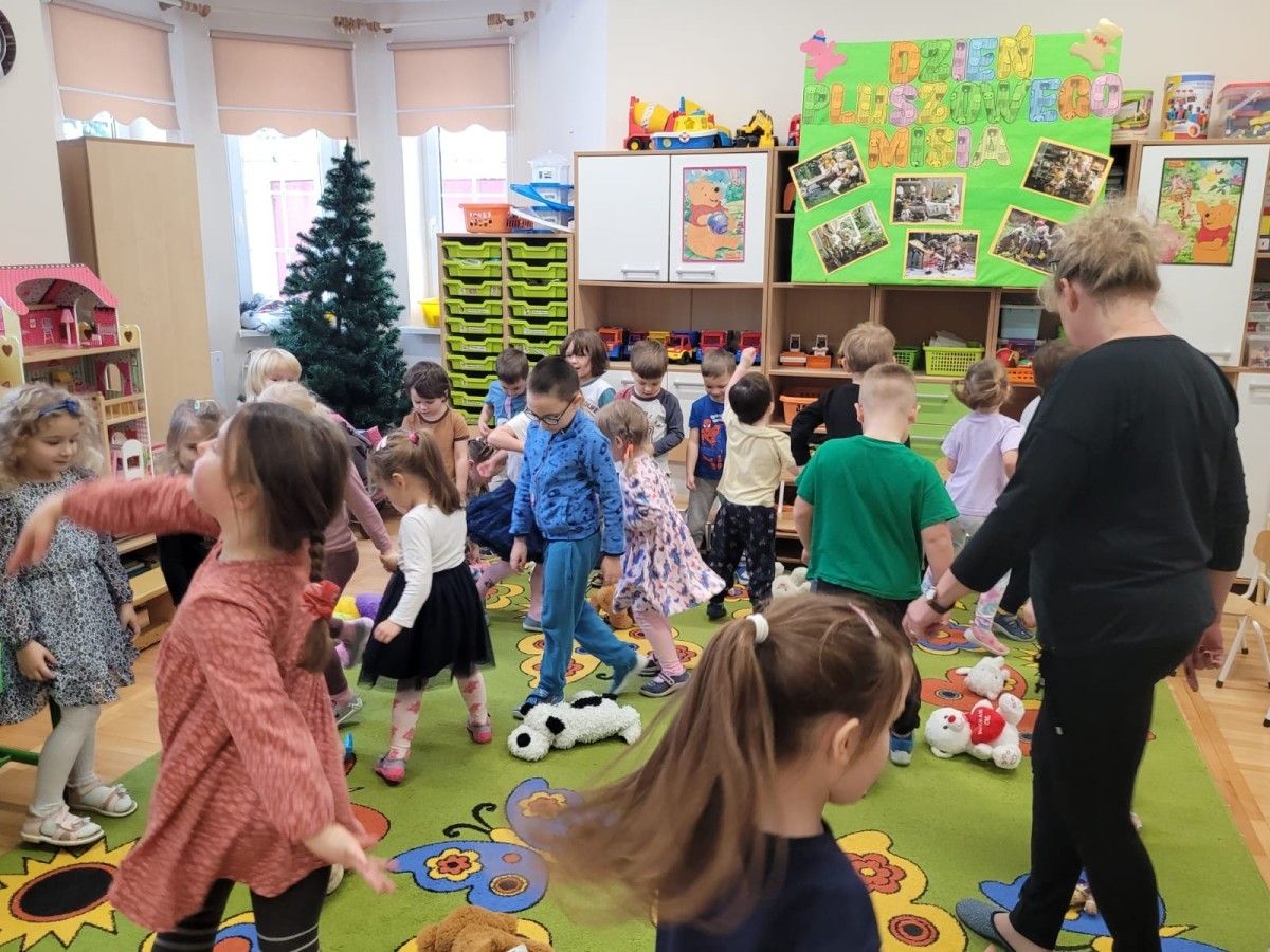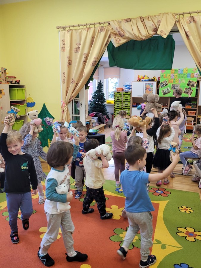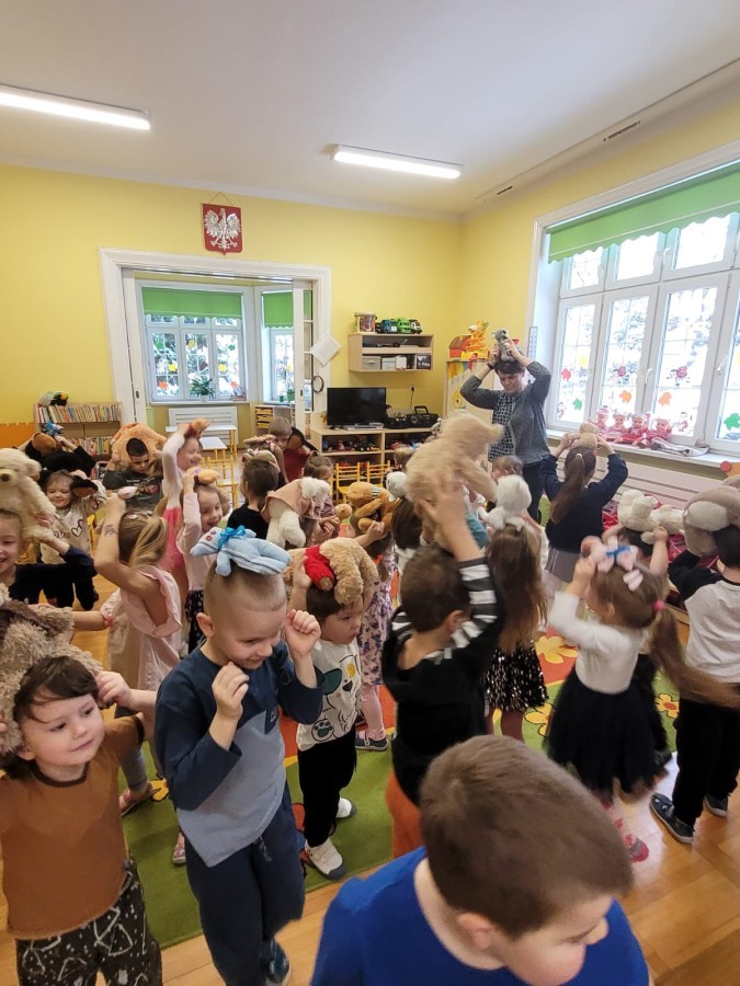 W czwartkowy poranek zgromadziły się dzieci z całego przedszkola wraz ze swoimi ulubionymi pluszowymi misiami z okazji ich święta. Po wstępnej prezentacji przy muzyce prowadząca imprezę Pani Ela zaprosiła przedszkolaki do fantastycznych konkursów. Były wśród nich: składanie obrazków pociętych na części, zjadanie palucha kukurydzianego, zlizywanie miodku z talerzyka, rozwiązywanie zagadek związanych z misiami. Wszystko było przeplatane tańcami z misiem albo dla misia oraz piosenkami tj. „Pluszowy miś”, „Jadą, jadą misie”. Na koniec dzieci złożyły życzenia misiom i odśpiewały tradycyjne „Sto lat”.