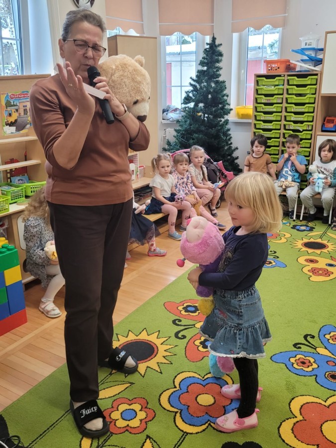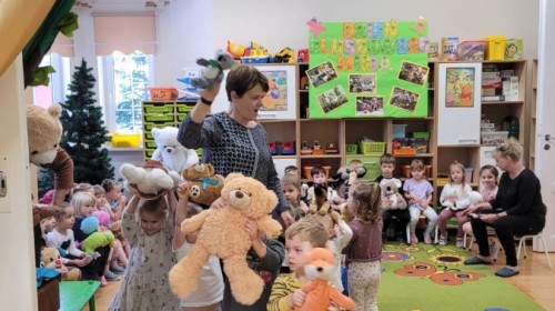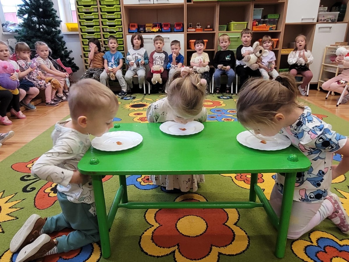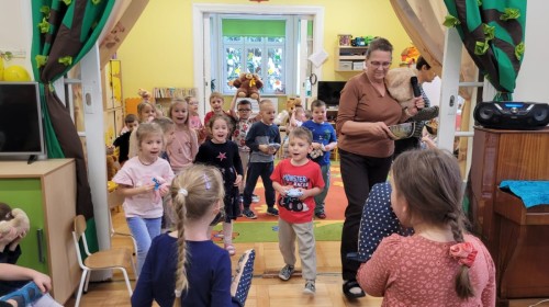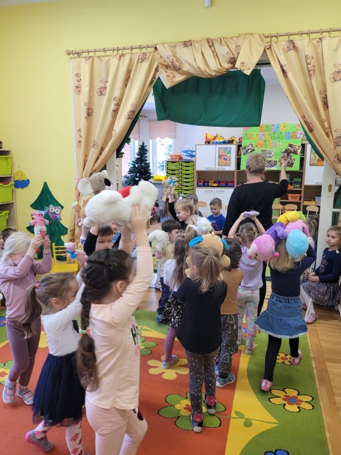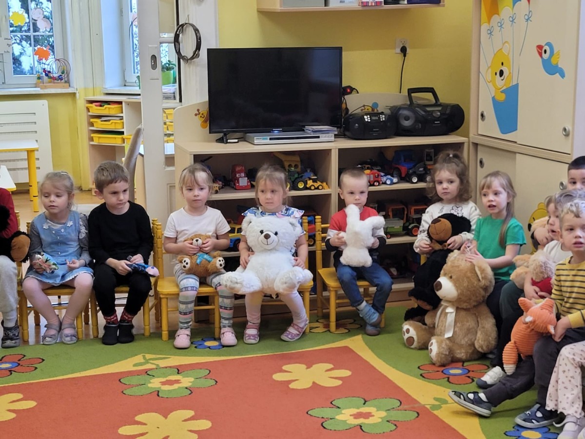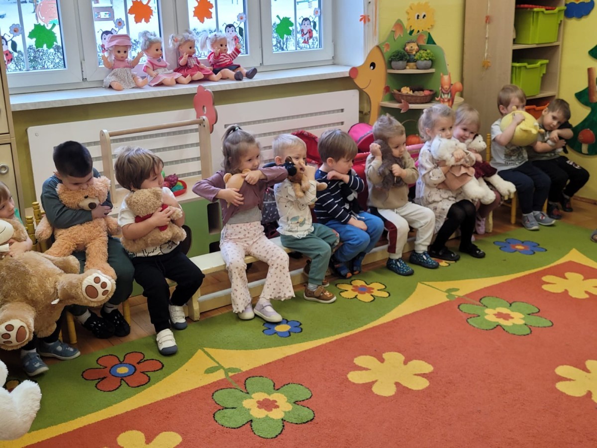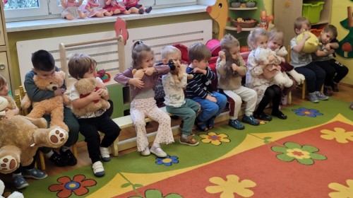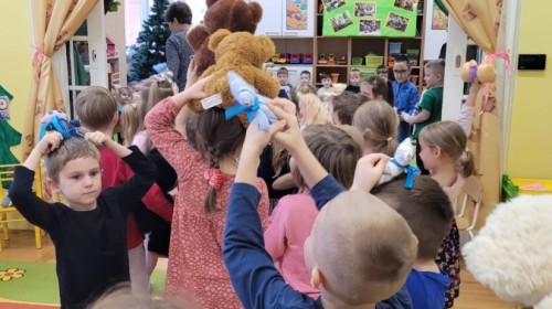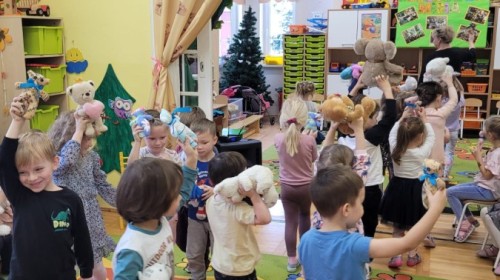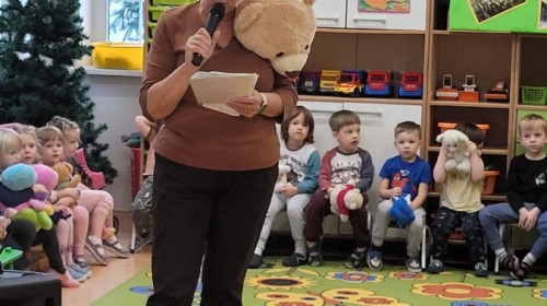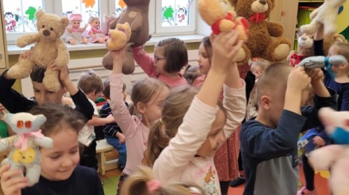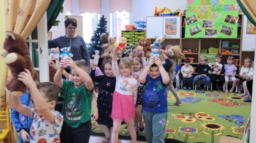 W czwartkowy poranek zgromadziły się dzieci z całego przedszkola wraz ze swoimi ulubionymi pluszowymi misiami z okazji ich święta. Po wstępnej prezentacji przy muzyce prowadząca imprezę Pani Ela zaprosiła przedszkolaki do fantastycznych konkursów. Były wśród nich: składanie obrazków pociętych na części, zjadanie palucha kukurydzianego, zlizywanie miodku z talerzyka, rozwiązywanie zagadek związanych z misiami. Wszystko było przeplatane tańcami z misiem albo dla misia oraz piosenkami tj. „Pluszowy miś”, „Jadą, jadą misie”. Na koniec dzieci złożyły życzenia misiom i odśpiewały tradycyjne „Sto lat”.