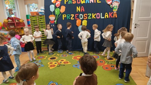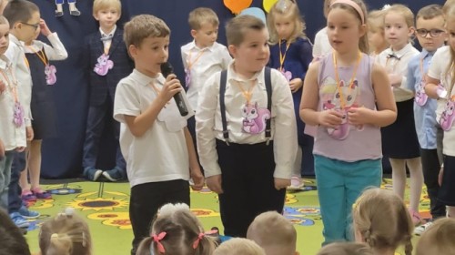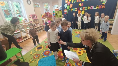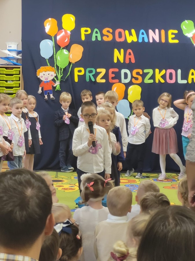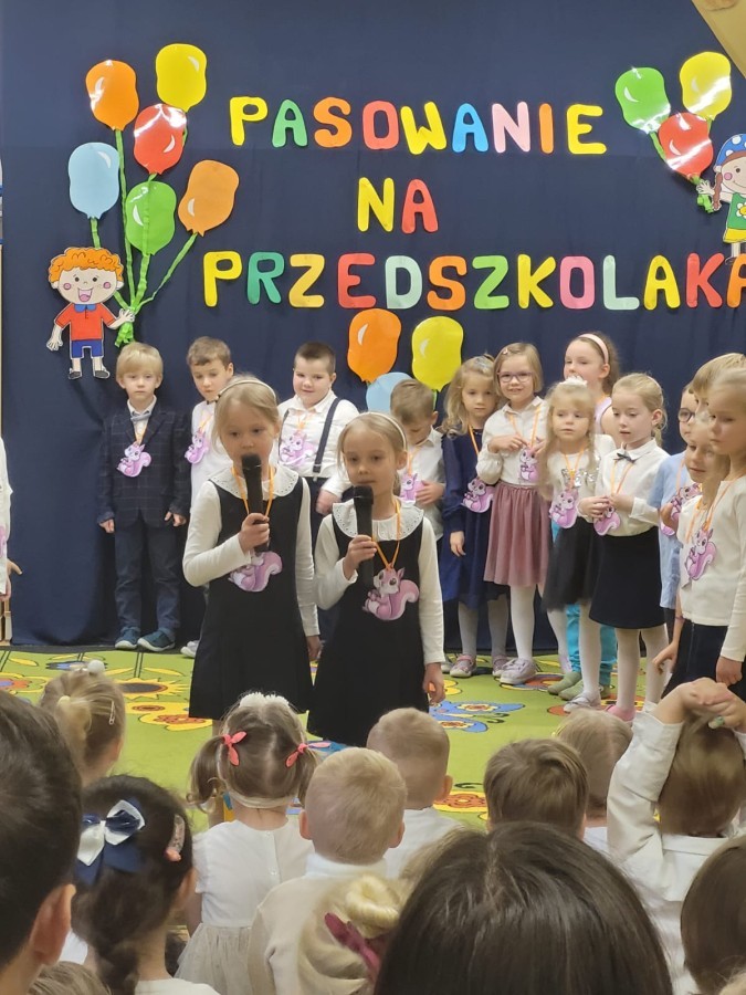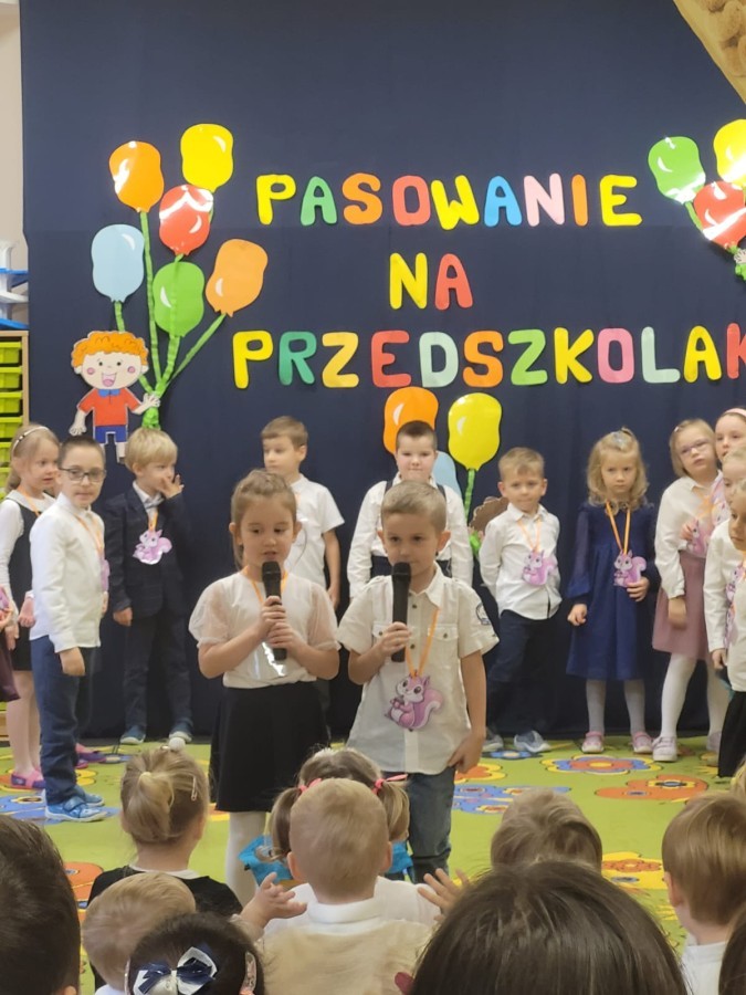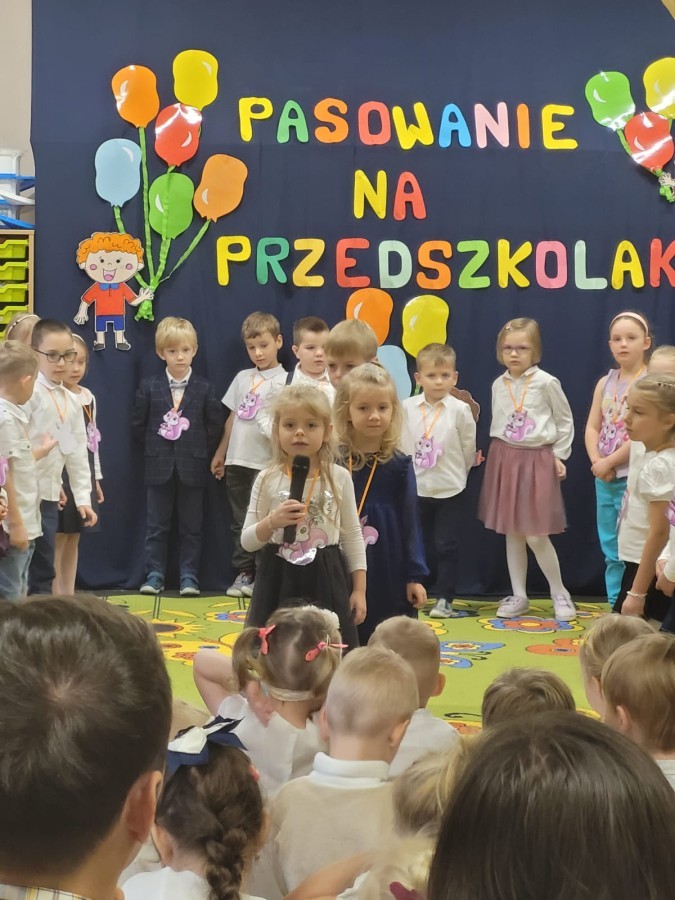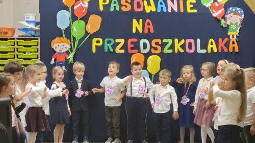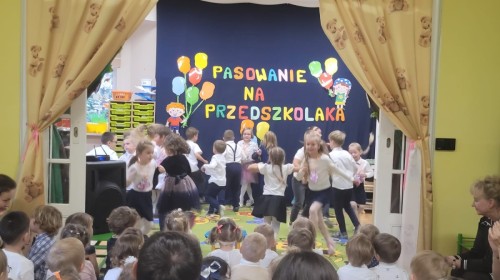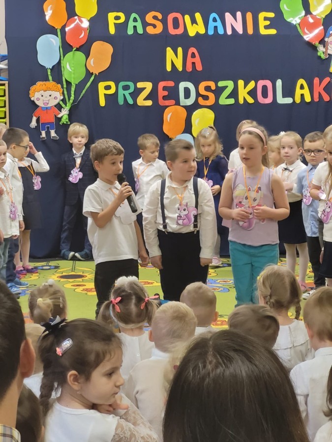 W uroczystości udział wzięły również starsze dzieci, które miały swoje własne, równie ważne pasowanie. Średniaki i starszaki zaprezentowały krótki program artystyczny, pokazując jak wiele się już nauczyły. Po występach każde dziecko zostało uroczyście pasowane na średniaka lub starszaka – to kolejny krok w ich przedszkolnej drodze, świadczący o rozwoju, zdobywaniu nowych umiejętności i coraz większej samodzielności. Na pamiątkę tego wydarzenia wszystkie dzieci otrzymały słodki upominek oraz medal, które będzie im przypominać o tym wyjątkowym dniu.