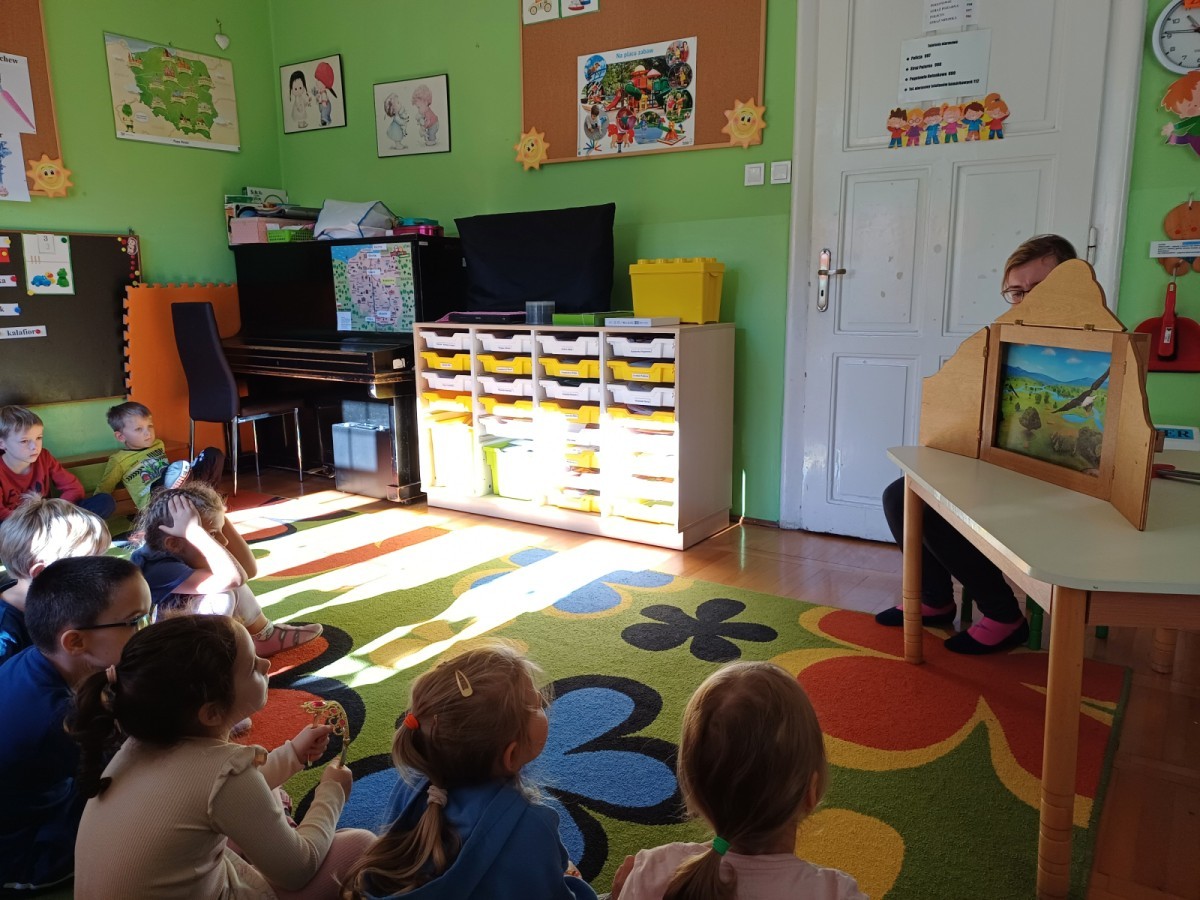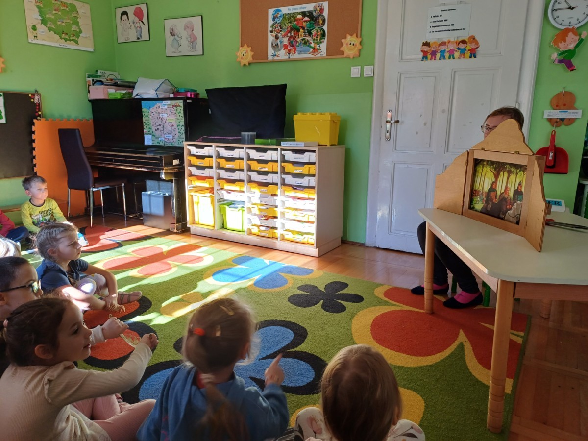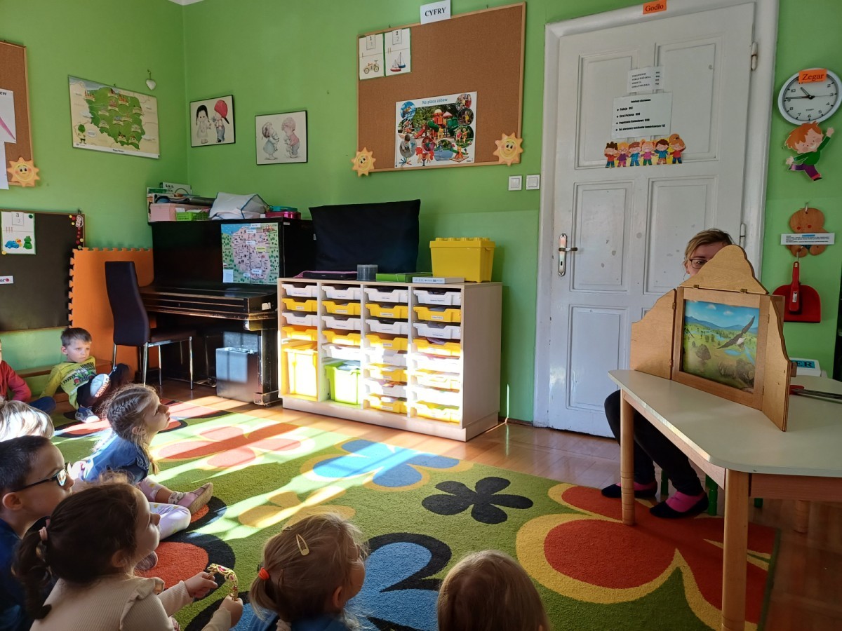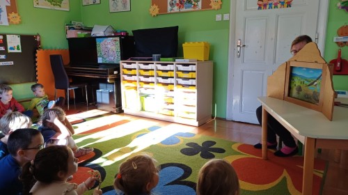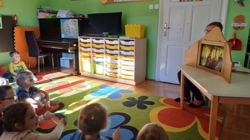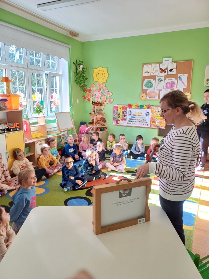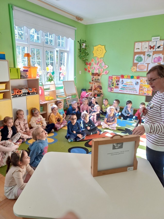 KAMISHIBAI (Papierowy Teatr) – zapoznanie z magicznym drewnianym teatrzykiem i techniką opowiadania, wywodzącą się z Japonii, wykorzystującą plansze z obrazkami i tekstem. Goszcząca w naszym Przedszkolu przedstawicielka Biblioteki Pedagogicznej Wojewódzkiej w Bielsku – Białej zaprezentowała dzieciom tą techniką przedstawiając Legendę o Lechu, Czechu i Rusie oraz przypominając i utrwalając symbole narodowe oraz ich kolory. Ilustracje towarzyszące opowieści wzbogaciły i rozwinęły wyobraźnię dzieci oraz wprowadziły do świata fantazji.