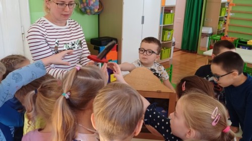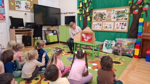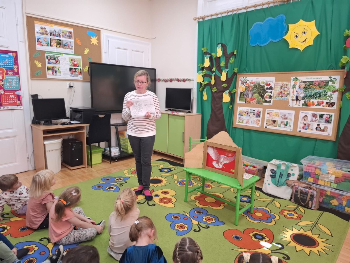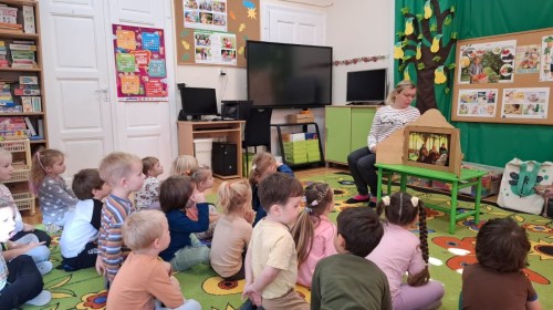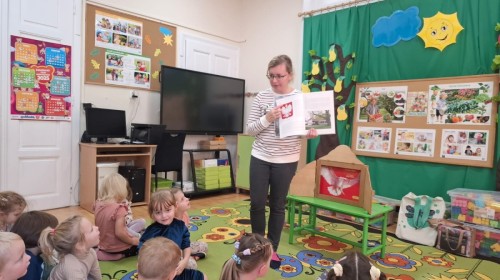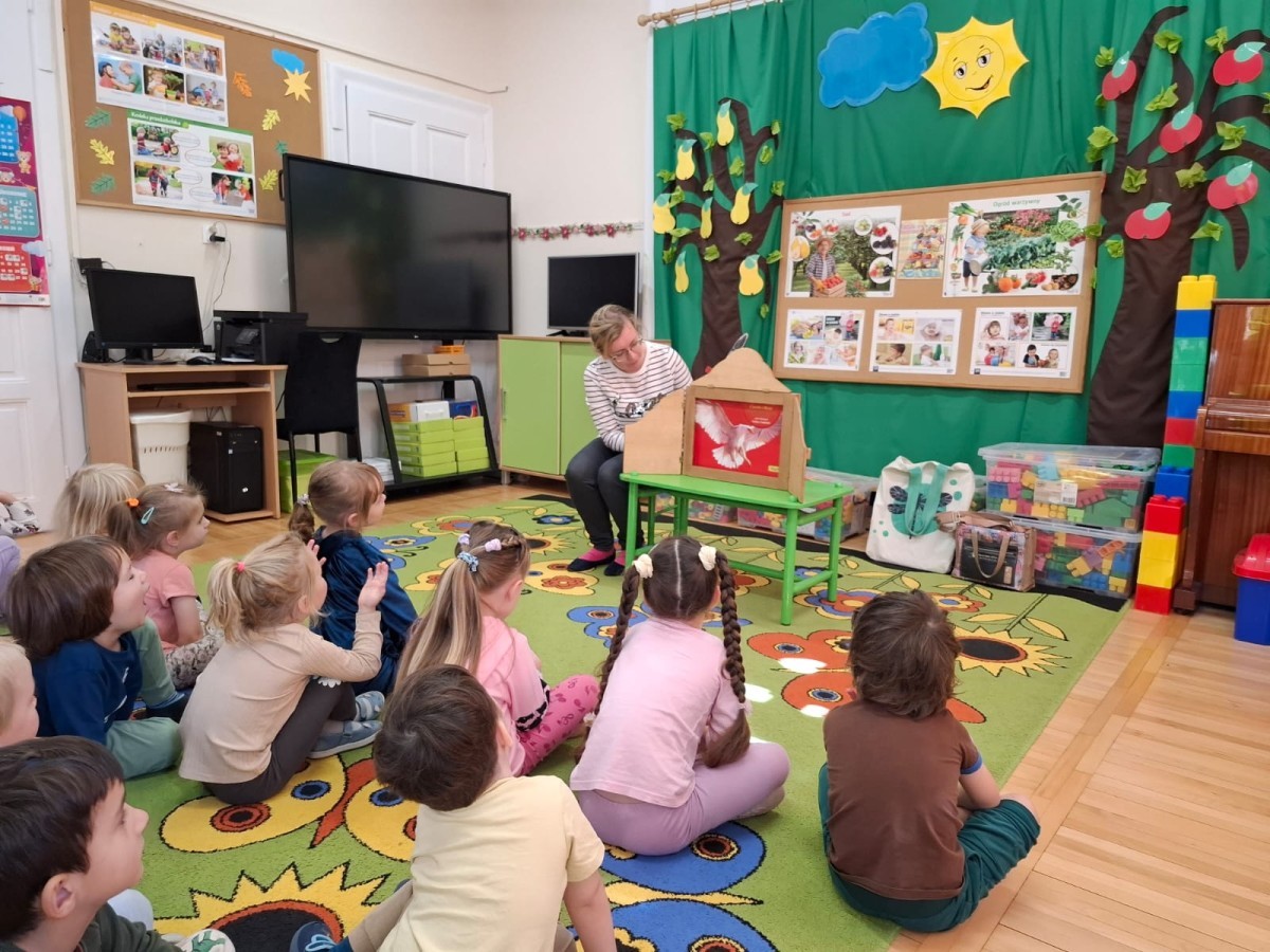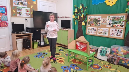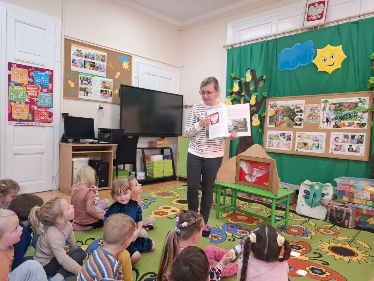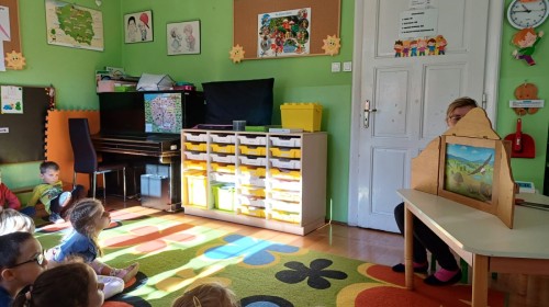 KAMISHIBAI (Papierowy Teatr) – zapoznanie z magicznym drewnianym teatrzykiem i techniką opowiadania, wywodzącą się z Japonii, wykorzystującą plansze z obrazkami i tekstem. Goszcząca w naszym Przedszkolu przedstawicielka Biblioteki Pedagogicznej Wojewódzkiej w Bielsku – Białej zaprezentowała dzieciom tą techniką przedstawiając Legendę o Lechu, Czechu i Rusie oraz przypominając i utrwalając symbole narodowe oraz ich kolory. Ilustracje towarzyszące opowieści wzbogaciły i rozwinęły wyobraźnię dzieci oraz wprowadziły do świata fantazji.
